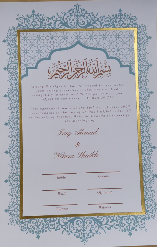 Aafreen Nikah Certificate: Powder Blue with Gold Embelishments
